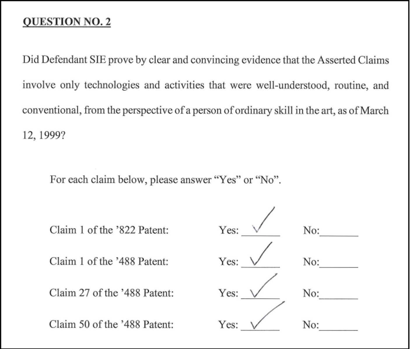 The jury found that all seven claims were not patent-eligible under Step Two. Dkt. 165 (Sept. 12, 2024). Judge Gilstrap’s final judgment found that the claims were invalid as being directed to patent-ineligible subject matter. Dkt. 179 (Sept. 13, 2019).