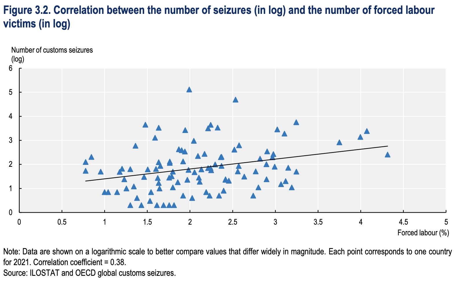 The EUIPO-OECD joint report on fakes and forced labor derives findings from global customs data and available labor statistics. Using econometric modeling that controls for income levels, trade openness and institutional quality, the study finds that a one-percentage-point increase in the prevalence of forced labor correlates with a 0.0076% increase in the value of counterfeit trade, which globally reaches an average value of $467 billion USD each year. The EUIPO-OECD report states that these findings confirm that labor exploitation is not simply a by-product of counterfeit trade but is instead a mutually reinforcing partner to the global trade in fakes.