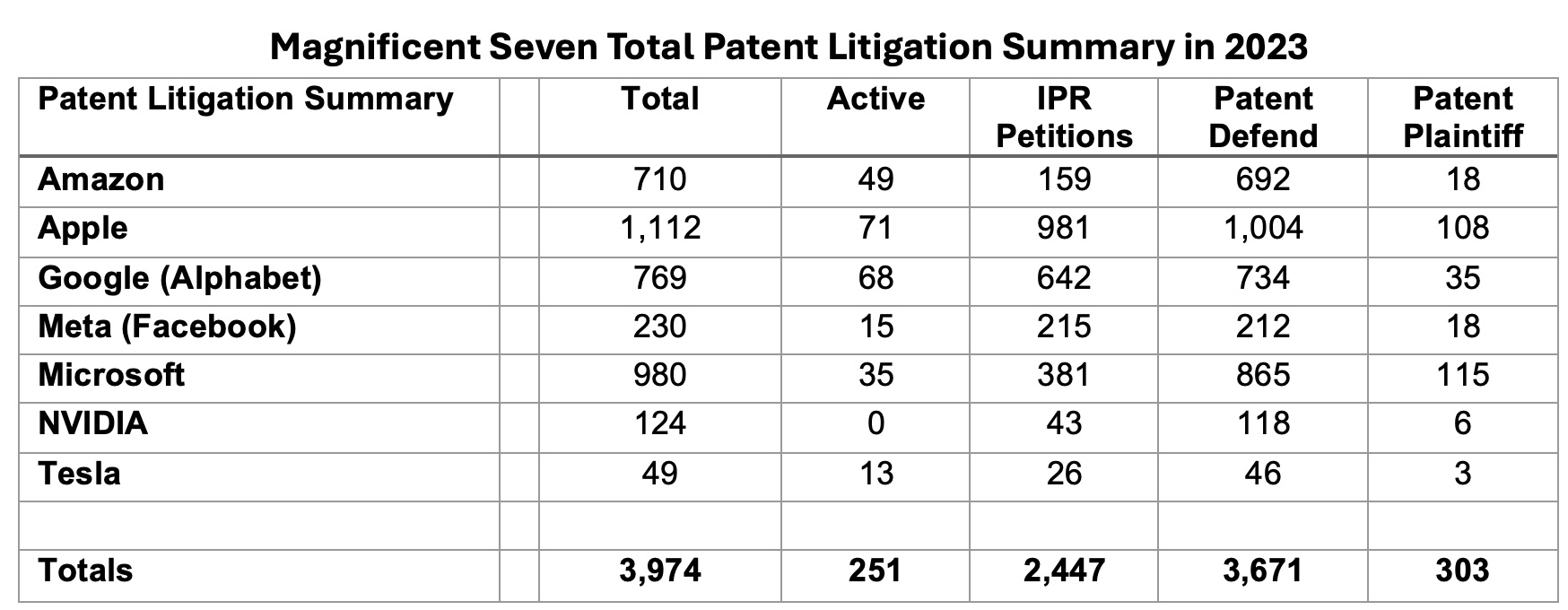 The Magnificent Seven has incredible exposure to patent litigation, with over 3,670 patent litigations (and counting) filed against the seven in 2023 (the latest information freely available through RPX Insights). Unsurprisingly, the Magnificent Seven were the biggest beneficiaries of the efforts to enact the AIA. As a result, the Magnificent Seven are leaders of invalidating third-party patents. Here’s a summary related to patent litigation as of year end 2023: