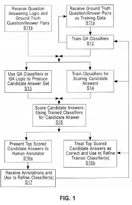 One patent protecting a machine learning technology which makes computing platforms like Watson so valuable was issued last June to IBM. U.S. Patent No. 9384450, titled Training Machine Learning Models for Open-Domain Question Answering System, claims a method for training a machine learning model which involves receiving trained classifiers for question answering to score candidate answers. The technique improves machine learning techniques using ground truths to answer questions posed by a person given the wide variety of syntax which could be used to pose a question. Interestingly, the method claimed here involves a human operator who judges whether a candidate answer is a correct answer for a given question, so while Watson has obviated some jobs, it looks like it’s creating new ones through its machine learning platforms.